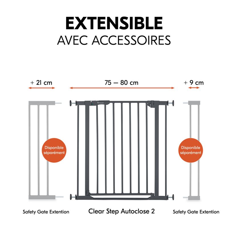 La Barrière de sécurité Clear Step Autoclose 2, adaptée aux ouvertures de 75 à 80 cm (extensible jusqu'à 122 cm grâce à des rallonges), est idéale pour sécuriser portes et escaliers dès que votre enfant commence à marcher.