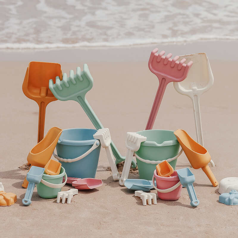 L'Ensemble de plage Eco junior de Miniland se compose d'un seau, d'une pelle, d'une pelle à tamis et d'un râteau, tous aux couleurs pastel.