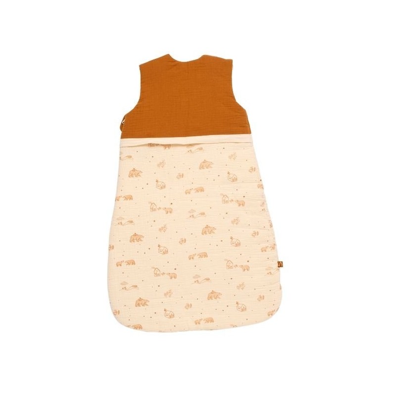 La Gigoteuse 0-6 mois Ours Hiver Orsino de Sauthon, confectionnée en double gaze de coton crème et camel, se distingue par sa broderie délicate de l’ours "Orsino".