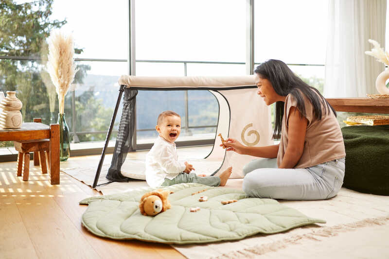 L'aire de jeux et lit parapluie Moov & Sleep se veut multi-usages, pouvant être utilisée tant en intérieur qu'en extérieur, grâce à ses côtés opaques pour la nuit et en maille filet aérée pour le jour, offrant ainsi un espace sécurisé et confortable pour l'enfant à tout moment. Son ouverture centrale renforce sa praticité, permettant un accès facile à l'enfant.