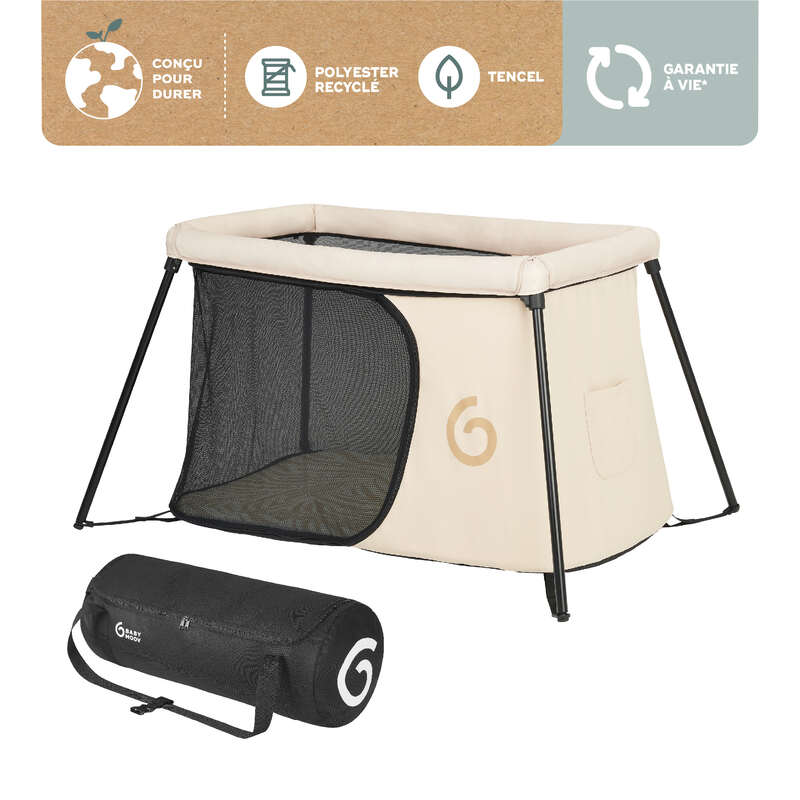 Pour les parents nomades, le sac de transport ultra-pratique inclus permet un portage à l'épaule ou en sac à dos, facilitant le transport de ce lit parapluie d'une légèreté exceptionnelle.